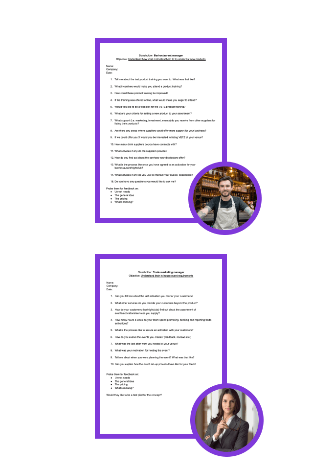 I developed personas for the two main stakeholders of the problem, the bar/restaurant manager and the trade marketing manager. I then designed interviews to find the frictions in the system and their unmet needs which led to the insight discovery that they were both frustrated with the current way of working.
