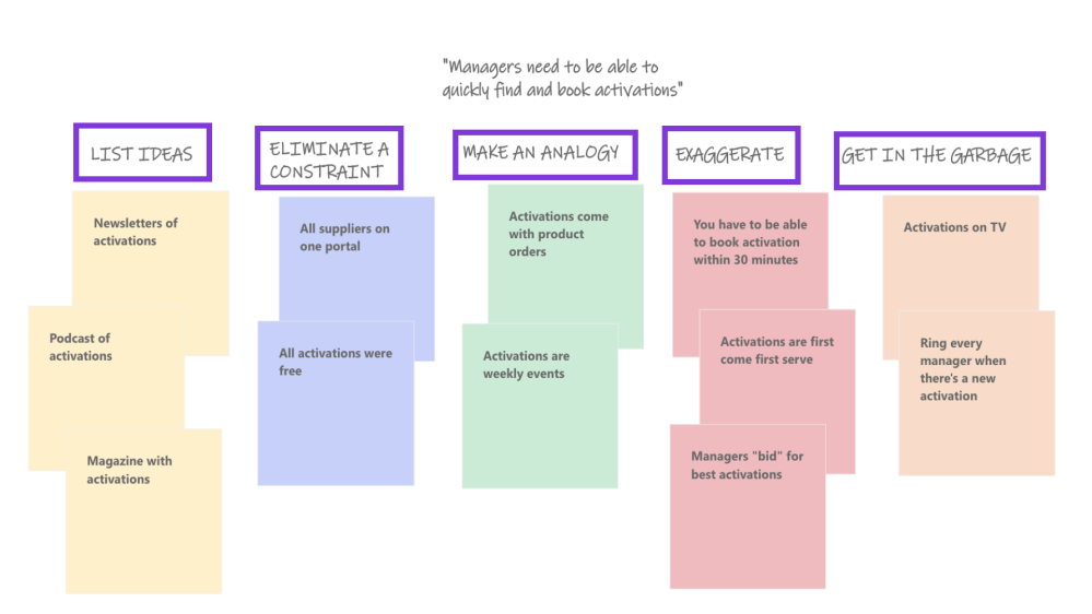 The six categories I use to push myself for fresh ideas are; listing them, eliminating a constraint, making an analogy, finding bad ideas and my personal favourite which is exaggerating the problem in order to find new solutions to it.